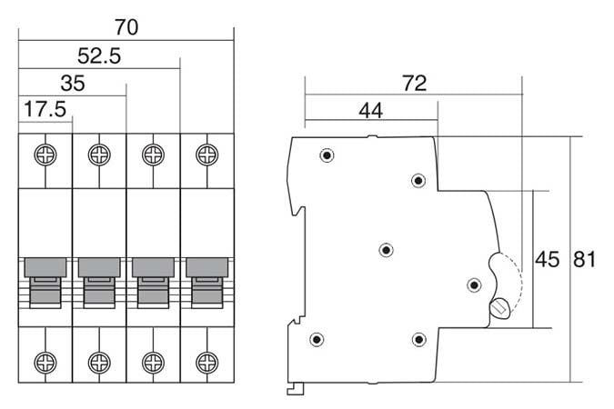 - Điện áp định mức: 1 cực 240V AC; 2 cực 240/415V AC; 3-4 cực 415V AC